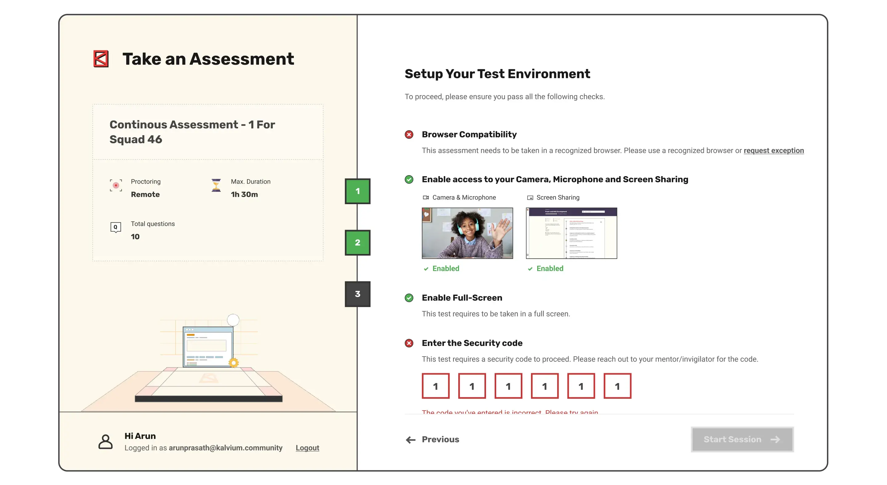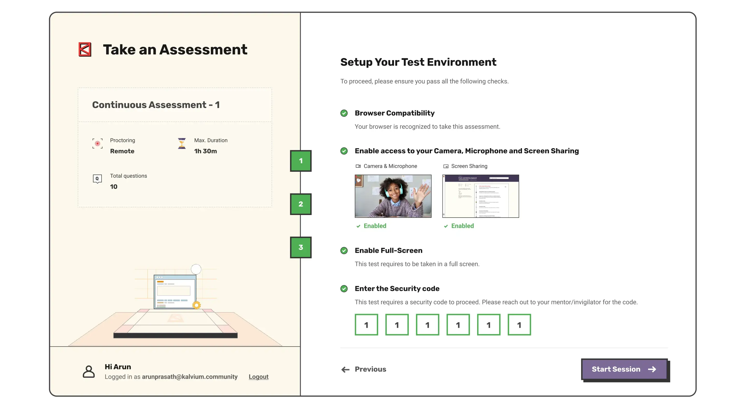 A Welcoming and Clear Onboarding The journey starts not with a test, but with reassurance. The onboarding flow guides students through a series of checks, confirming their setup is correct. This proactive approach prevents technical issues and builds confidence before the timer even starts.